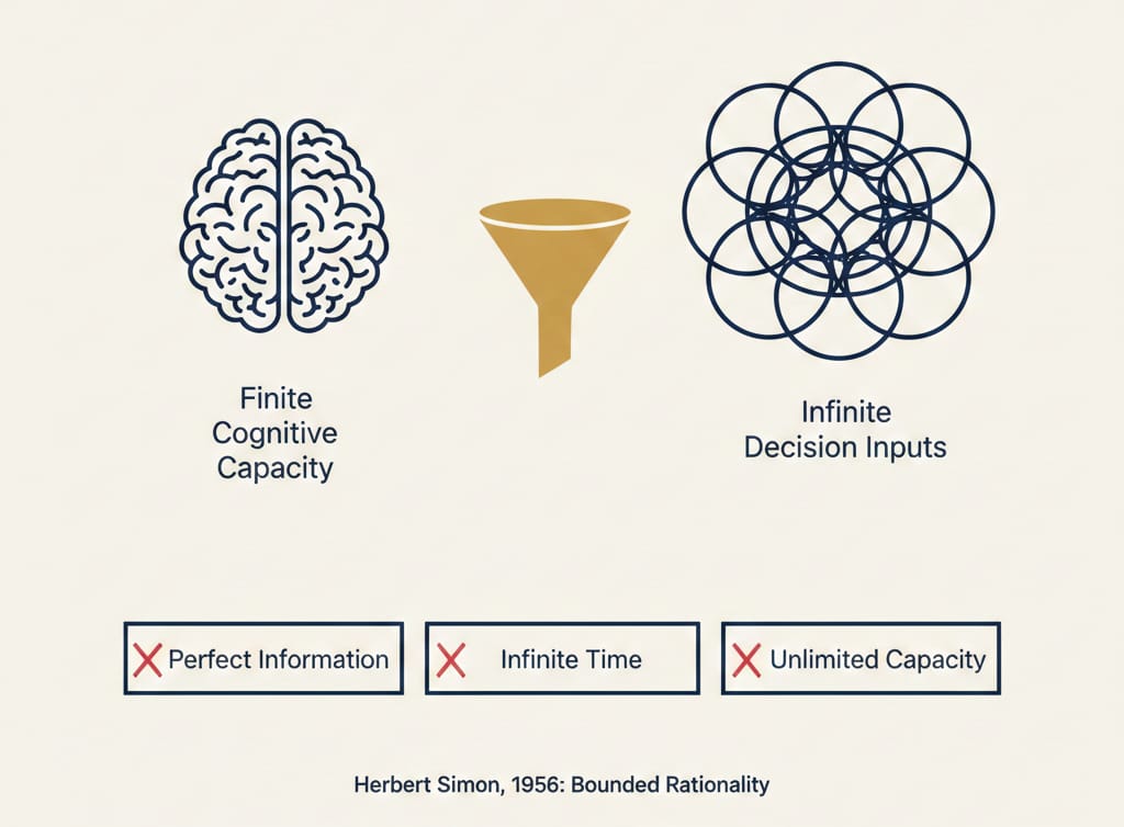 This is where bounded rationality becomes practical. Herbert Simon showed that perfect decisions require perfect information, infinite time, and unlimited cognitive capacity.